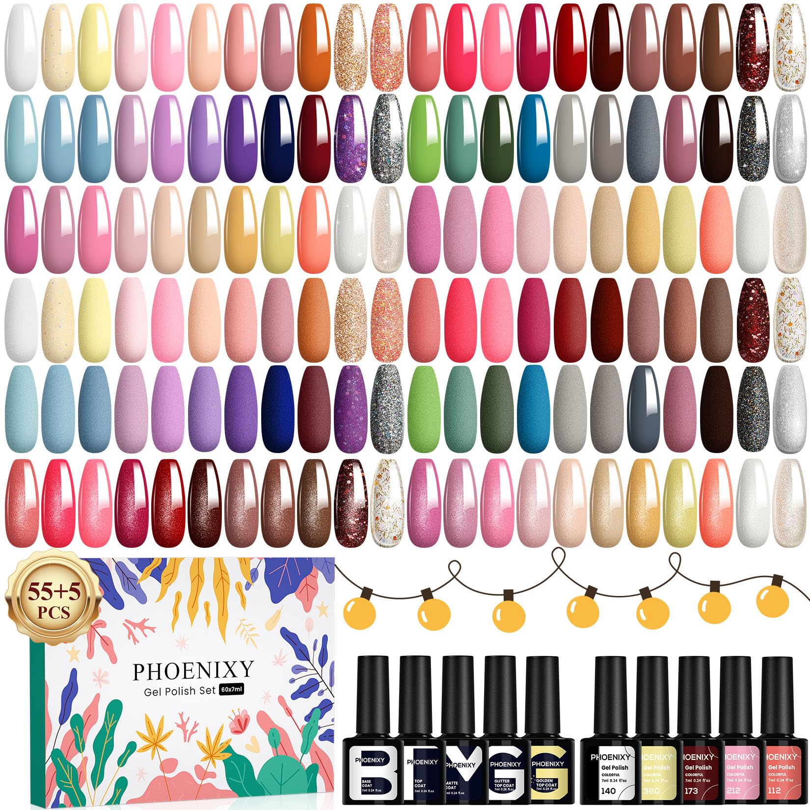 - Gel Nail Polish Set - Phoenixy gel nail polish set include 55x 7ml gel nail polishes, 7ml base coat, 7ml glossy top coat, 7ml matte top coat, 7ml glitter top coat, 7ml golden top coat. Let Phoenixy gel nail polish kit brings you a pleasurable manicure experience.