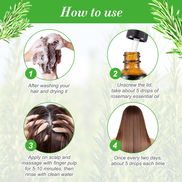1. There is no right or wrong way to apply rosemary oil to your hair, some prefer the oil to be applied directly to the hair and skin/body or diluted into any cream, shampoo or conditioner per 100ml Just add 2-3 drops. Others like to use a scalp massager shampoo brush to massage rosemary oil into their scalp. 2. Add a few drops of rosemary oil at the palm of your hands and gently massage the product into your scalp or skin. It might take some time to coat each hair section, but the hydrating results will be worth. When you're done keep it on your hair until your next wash day. 3. There is no standard as far as how often you should use rosemary oil, but we'd recommend one to two times a week for at least three months, as that's typically how long before you'll see new hair coming in. It's important to keep in mind that hair growth doesn't happen overnight regardless of what products you're using.